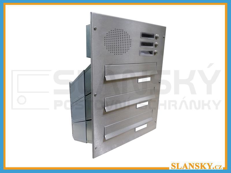 - 3x poštovní schránka D-041 šikmá k zazdění do sloupku + čelní deska s 3x zvonkem a HM URMET - NEREZ