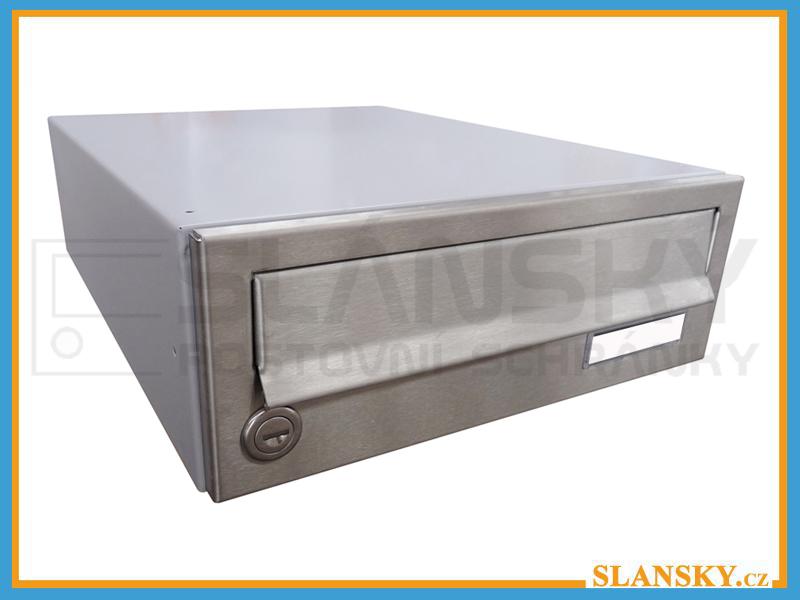 - Ležatá poštovní schránka s vhozovou sklapkou a předním výběrem pošty.